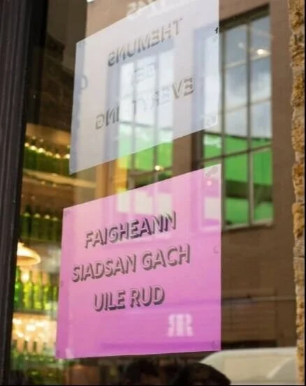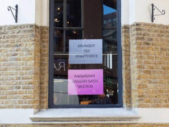 Array was established in 1994 by a group of early career artists intent on making a difference to the world of visual art in Belfast. Over the past 20 years Array has seen a vast number of artists come through the doors. Array’s collaborative actions use a DIY sensibility in response to the socio-political issues affecting Northern Ireland. Spot their work in the window of one of Borough Market’s much-loved pubs, a message in Gaelic that translates to “Themuns Get Everything” – Northern Irish dialect for “them ones.”